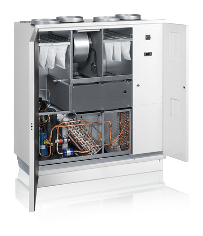 HP är en frånluftsvärmepump integrerad i ventilationsanordningen. HP frånluftsvärmepump som är integrerad i aggregatet återvinner energi ur frånluften. Tillsammans med den roterande värmeväxlaren återvinner frånluftsvärmepumpen praktiskt taget all värmeenergi från luften som blåses ut från byggnaden och återför det för uppvärmningsändamål. Den årliga värmeåtervinningseffektiviteten kan bli upp till 95 %!